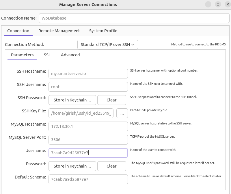 Select Standard TCP/IP over SSH as the connection method. Fill up the values gathered in the steps above: