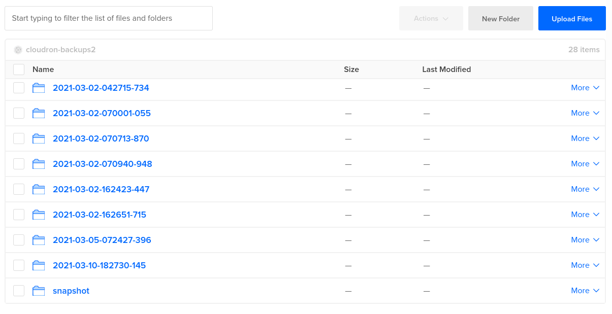 $ aws --endpoint-url=https://sfo2.digitaloceanspaces.com s3 ls s3://cloudron-backups2/