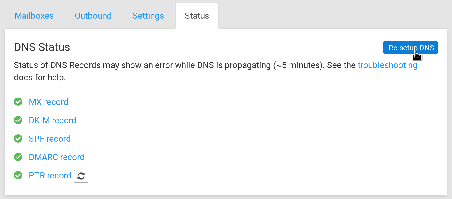 Re-setup DNS button in the Email -> Select domain -> Status page.