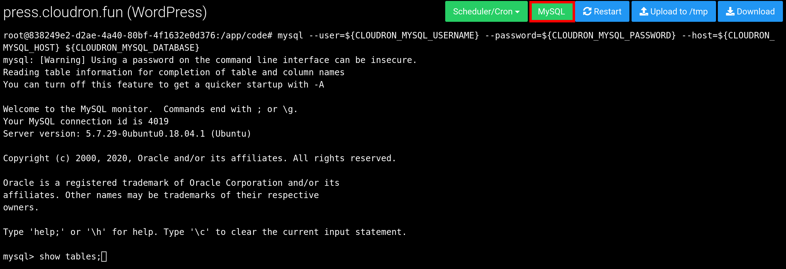 mysqldump -h${CLOUDRON_MYSQL_HOST} -u${CLOUDRON_MYSQL_USERNAME} -p${CLOUDRON_MYSQL_PASSWORD} --single-transaction --routines --triggers --no-tablespaces ${CLOUDRON_MYSQL_DATABASE} > /tmp/mysqldump.sql