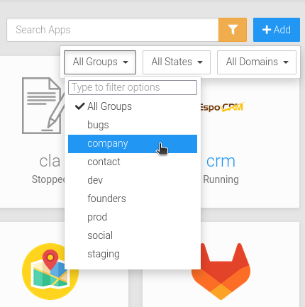 Knowledge BaseDashboardOn this pageDashboard Filter Apps in the dashboard can be filtered using one or more of the following filters: Group name App State Domain name