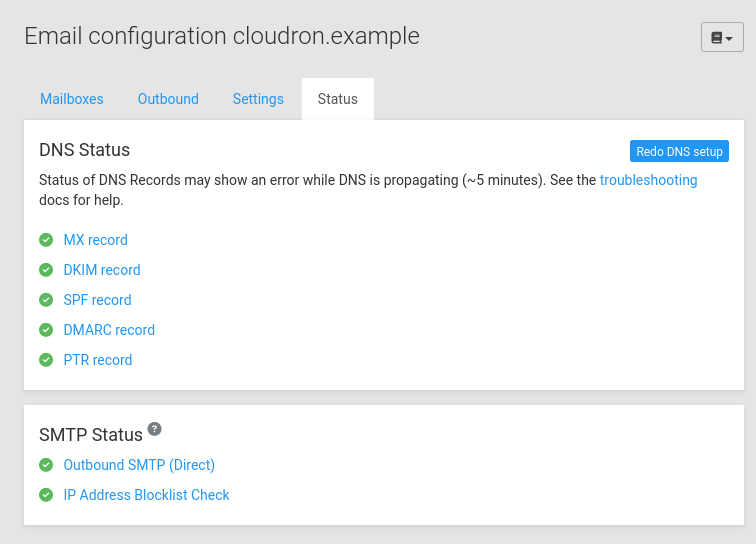 The status of the DNS and Email delivery is available in the Status tab of the mail domain (Email -> Select Domain -> Status).