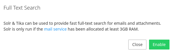 If search is not working, check if the solr index is corrupt. You can check if this is the case by running docker exec -ti mail /bin/bash