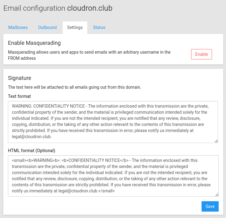 MAIL FROMis the same as the authenticated user. Users cannot spoof each other. - All outbound mails from Cloudron are