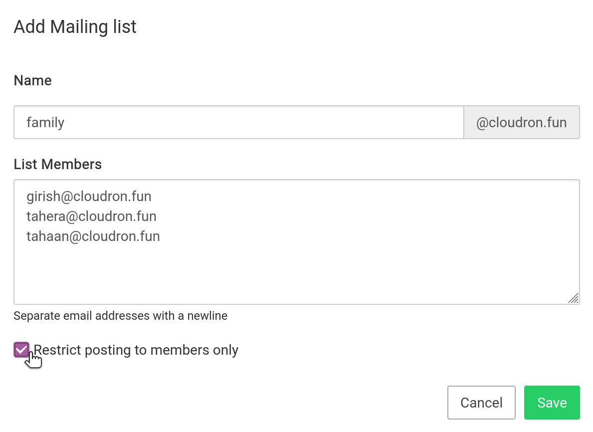 Cloudron does not support creating a mailing list (i.e) a list that allows members to subscribe/unsubscribe.