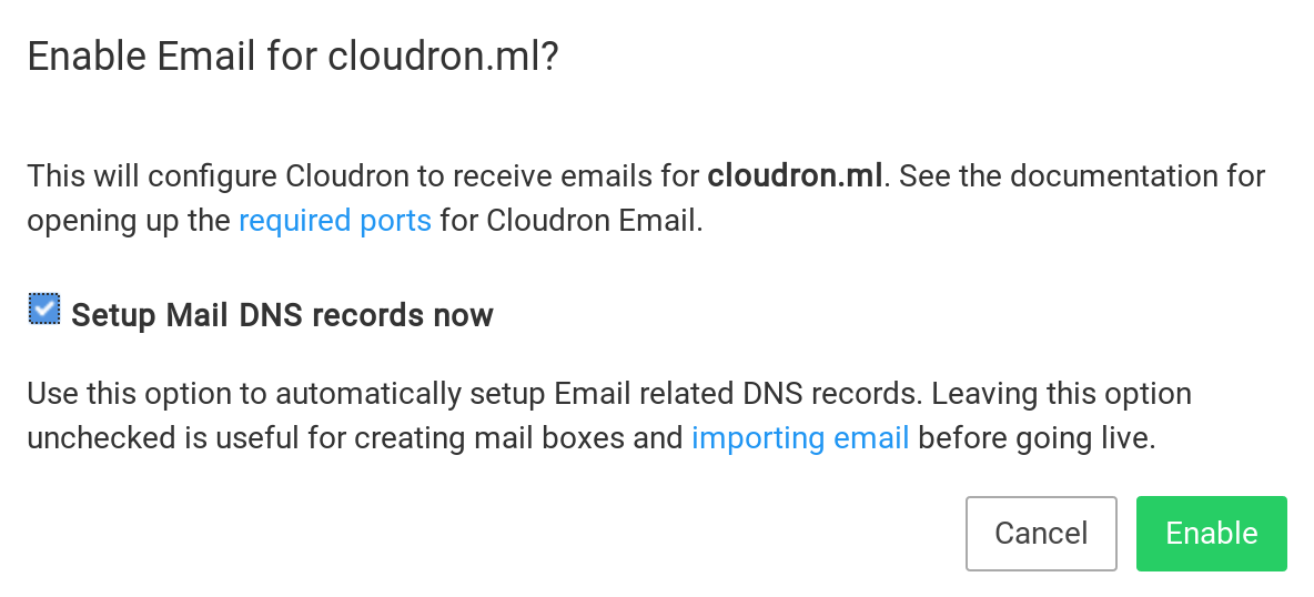 When the Setup Mail DNS records now option is checked, Cloudron will automatically update