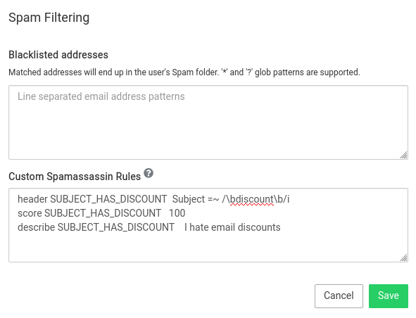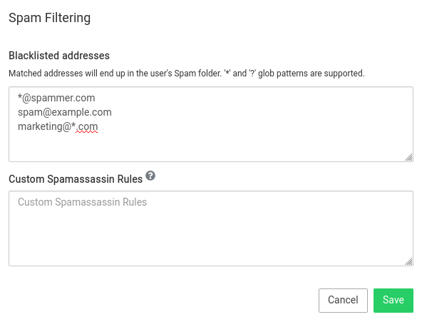 - Anti-spam. Users can train the spam filter by marking mails as spam. Built-in rDNS and zen spamhaus lookup. Admins can add custom spam rules for the entire server.