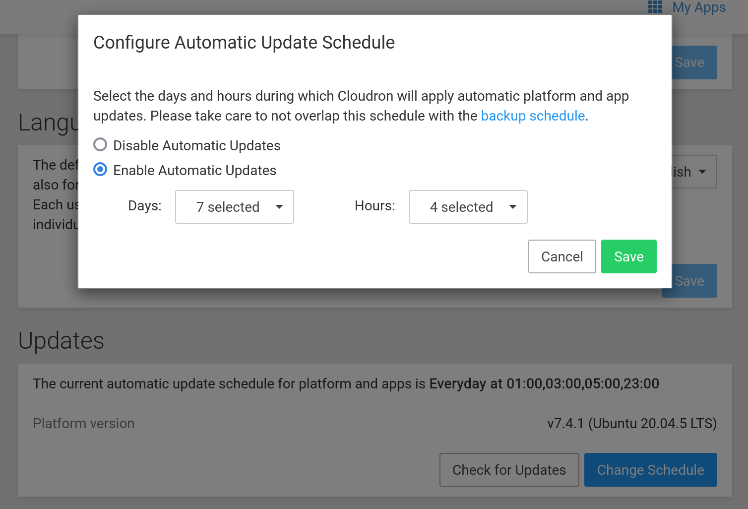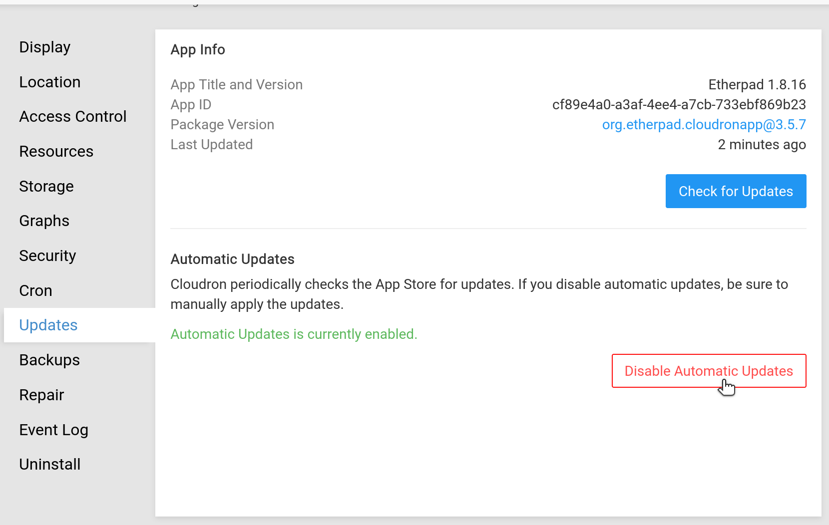To disable updates entirely, select Update manually. When automatic updates are disabled, the Cloudron
