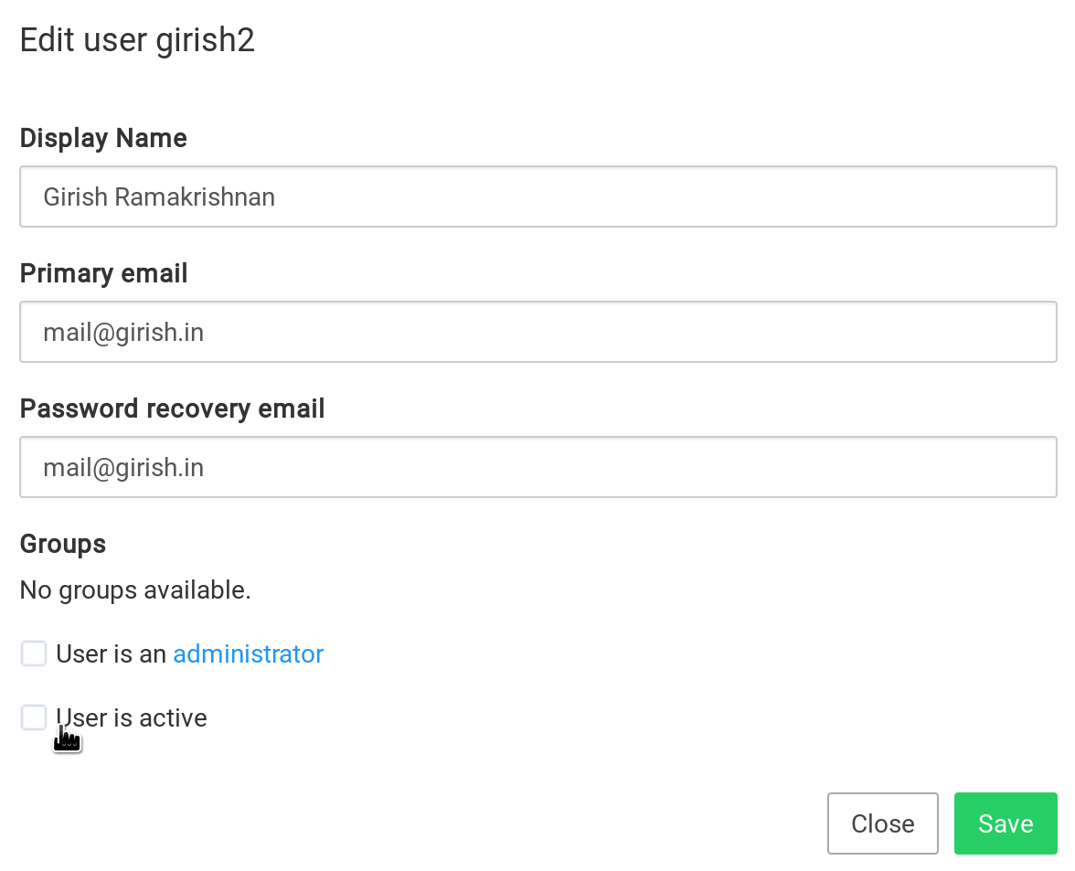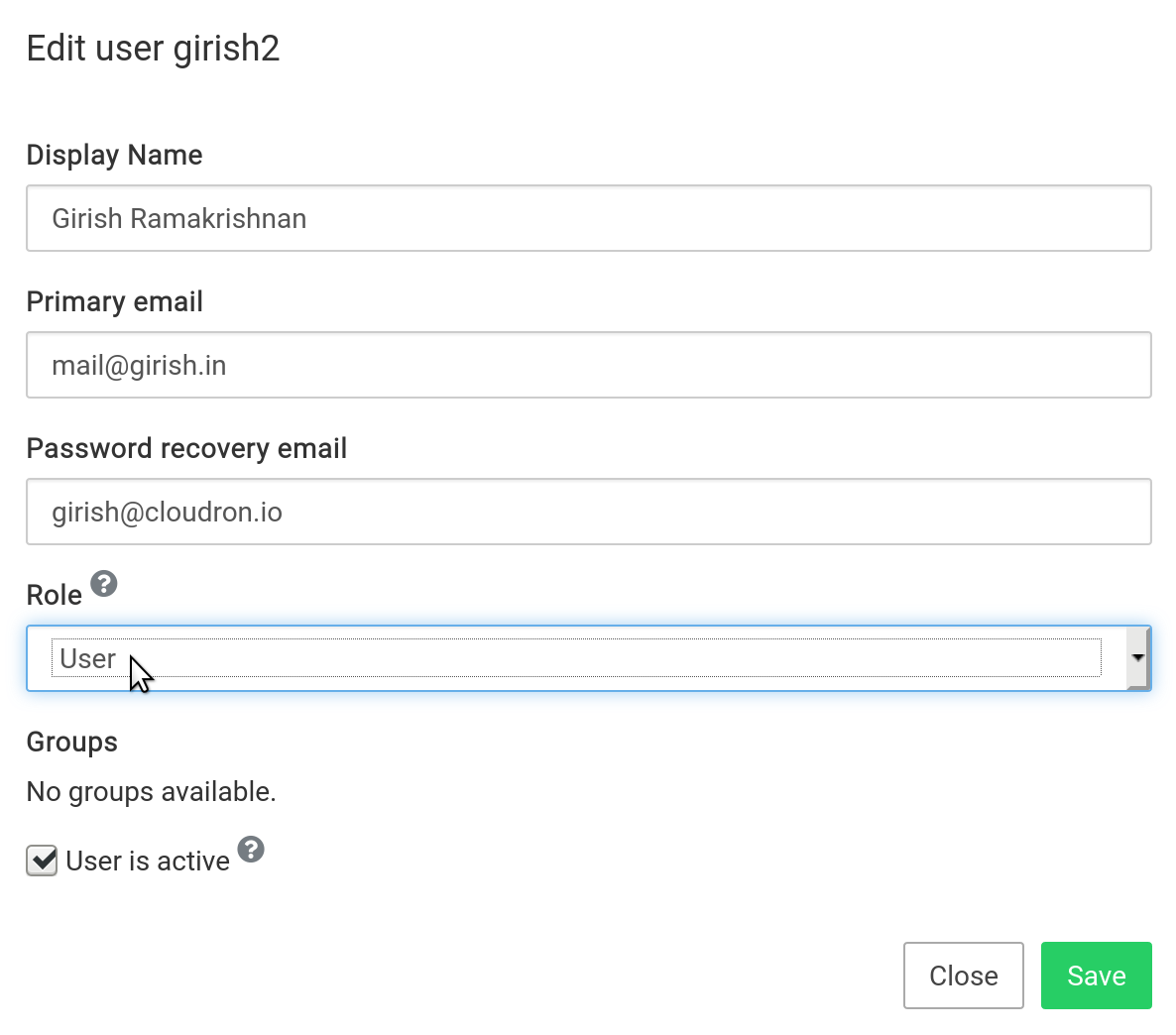 To disable a user, uncheck the User is active option. Doing so, will invalidate all