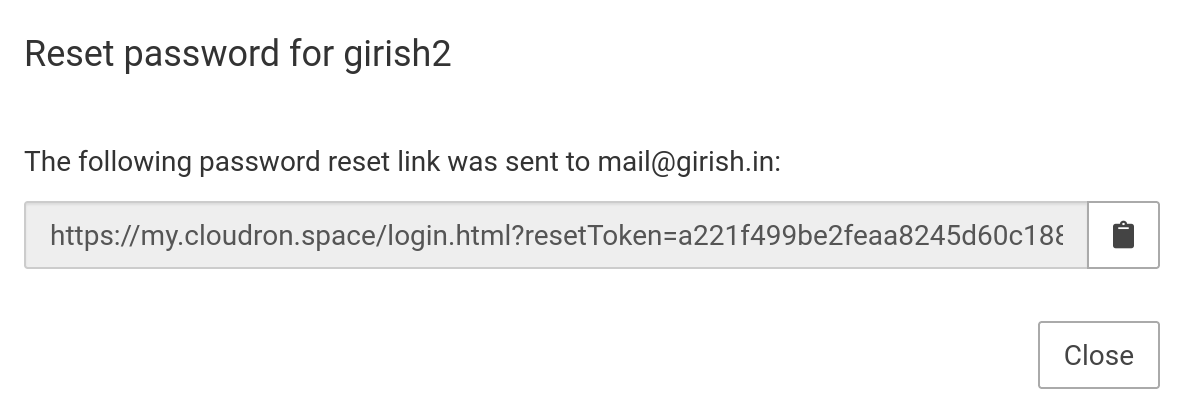 This will open up a dialog showing the password reset link. If email delivery is not working for some reason, the link can be sent to the user by some other means.