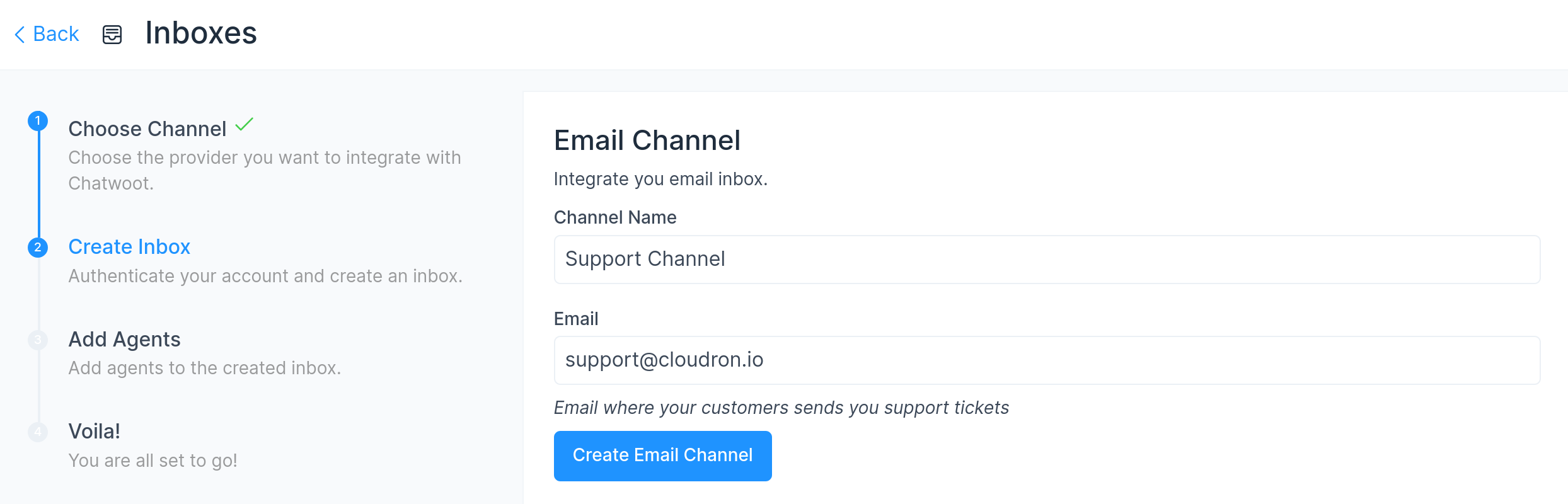 To configure Chatwoot to use Cloudron mail, add an inbox channel of type email with the following IMAP and SMTP configuration: